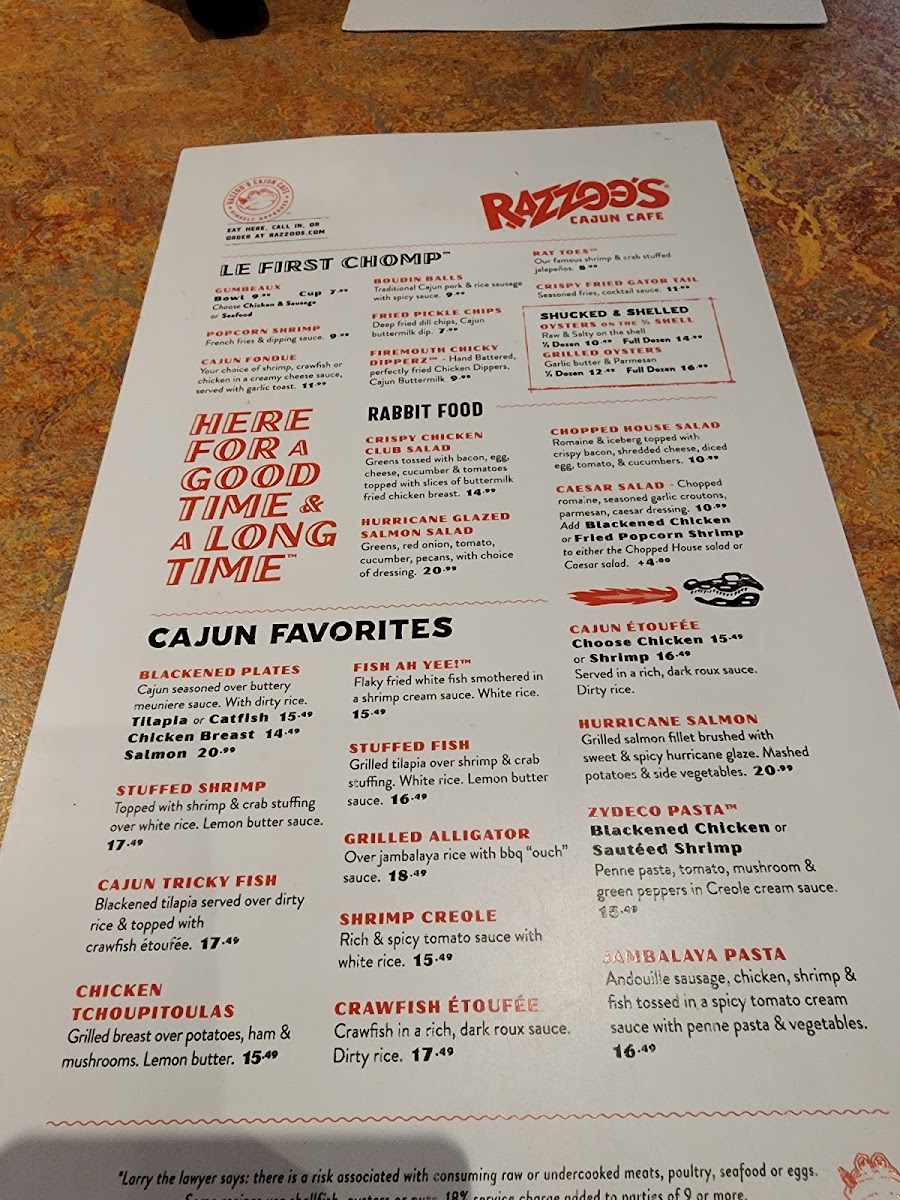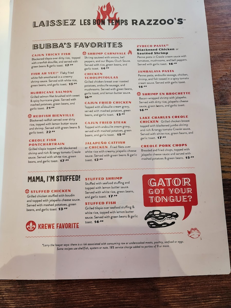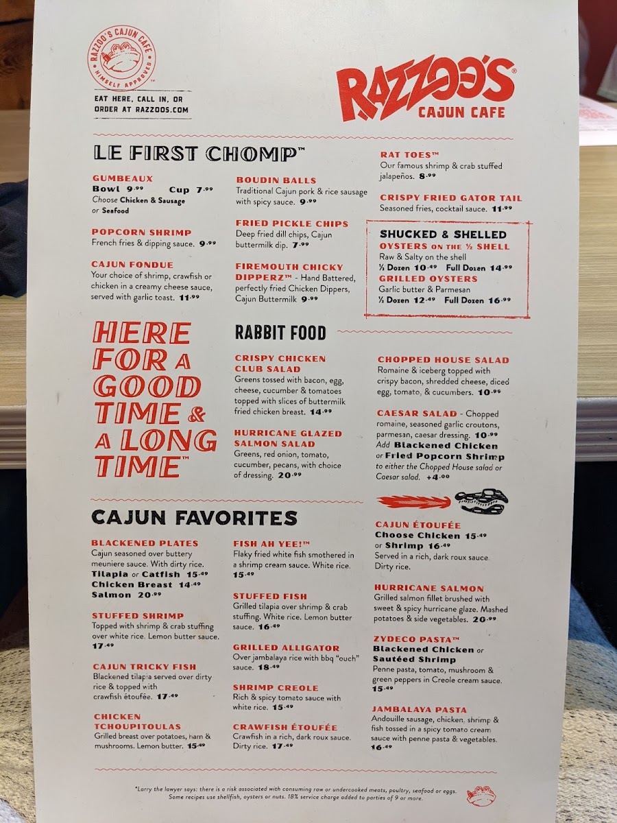 Welcome to Razzoo's Cajun Cafe in Lewisville, where the rich flavors of Cajun cuisine come alive. Nestled at 1900 S Stemmons Fwy, this lively eatery offers a diverse menu that delights the senses. Start with a Chopped House Salad or a classic Caesar Salad, both perfect for complementing your meal.
